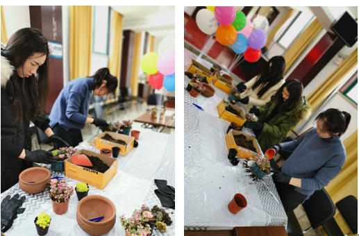 女職工們擼起袖子,帶上手套,跟著園藝師從灌裝填土、多肉種植、面層鋪石到灑水定型,一步步完成多肉植物DIY制作,并將其帶回辦公室。每一個(gè)多肉盆栽“成品”形態(tài)各異,蠢萌可愛(ài)。
