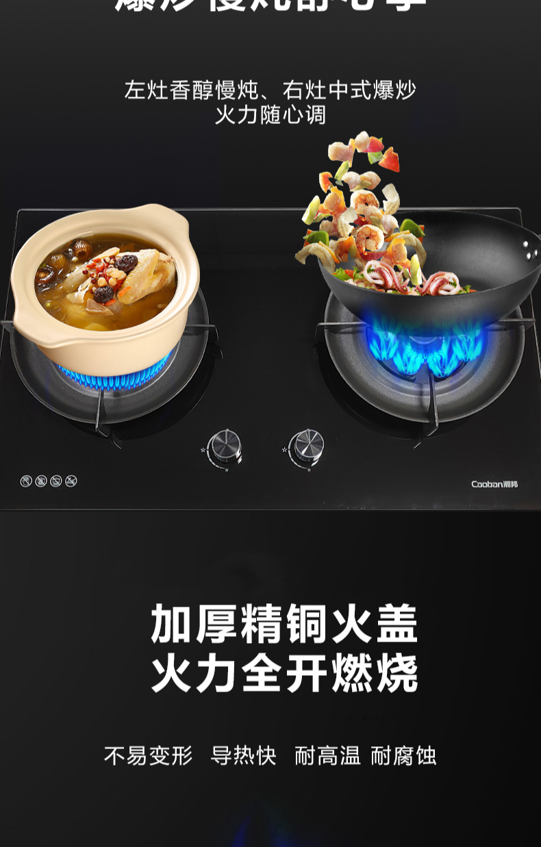 5 2kW大火力,九頭猛火灶,63%熱效率,6mm厚鋼化玻璃面板,4層防爆