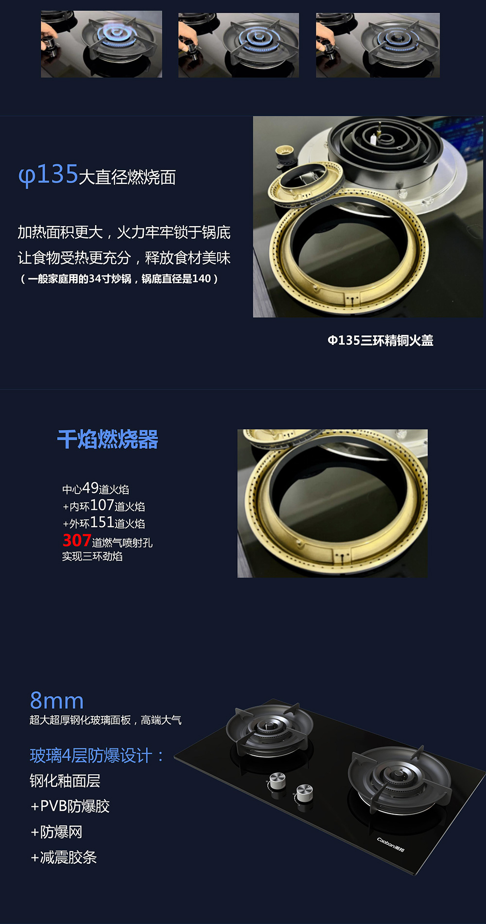 三環精控灶,225°6段火力調節,φ135大直徑燃燒面。