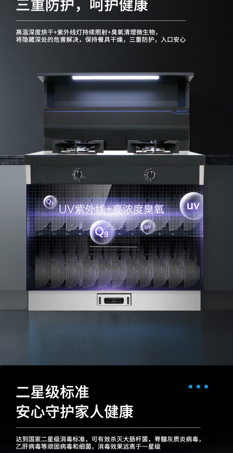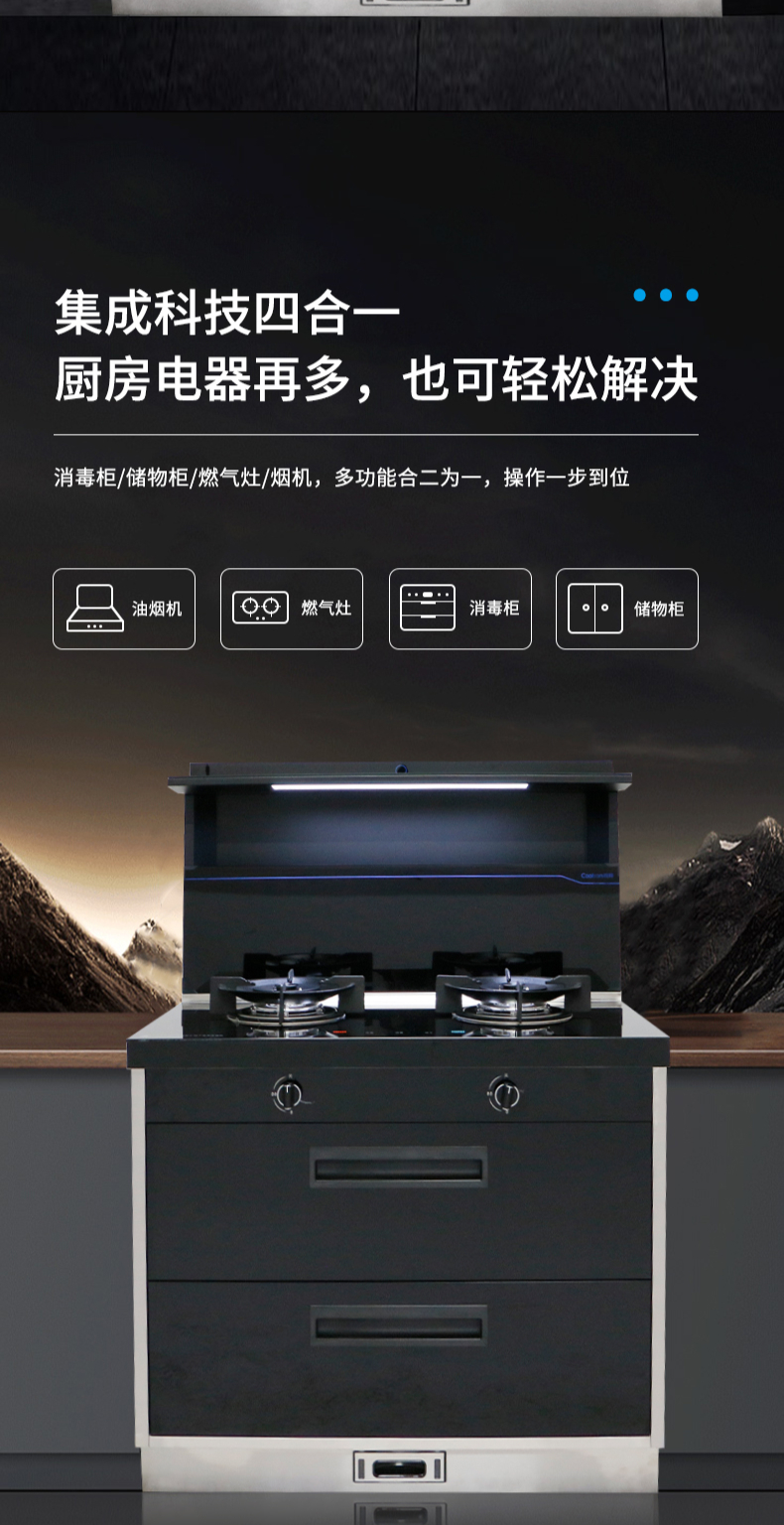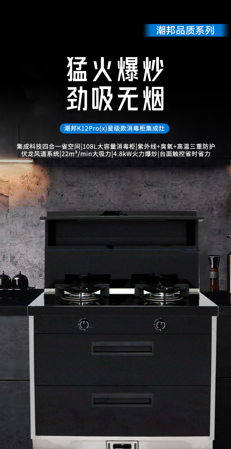 集成科技四合一省空間|108L大容量消毒柜|紫外線+臭氧+高溫三重防護(hù) 伏龍風(fēng)道系統(tǒng)|22m3大吸力|4 8kW火力爆炒|臺(tái)面觸控省時(shí)省力